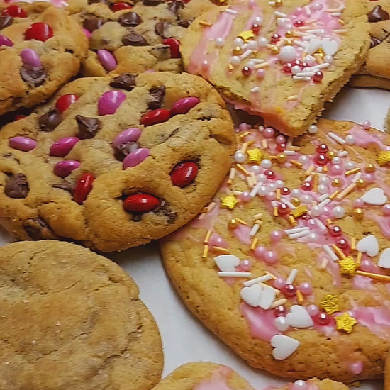 One box containing a mixture of vanilla cookies with Sprinkles and Valentine M&Ms chocolate chip cookies.